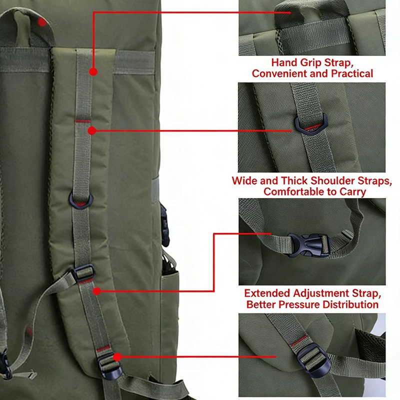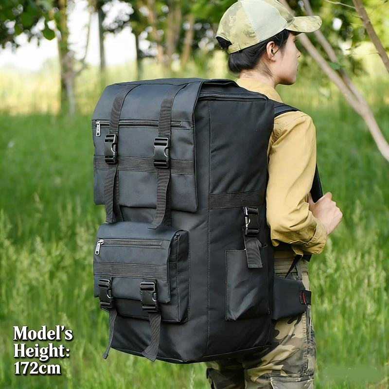 With its massive 130L storage, this backpack easily accommodates multi-day trips, camping gear, and all your essential equipment. Multiple compartments and organizational pockets help you pack efficiently, while adjustable padded shoulder straps, a reinforced back panel, and hip belts provide maximum comfort and support for heavy loads.